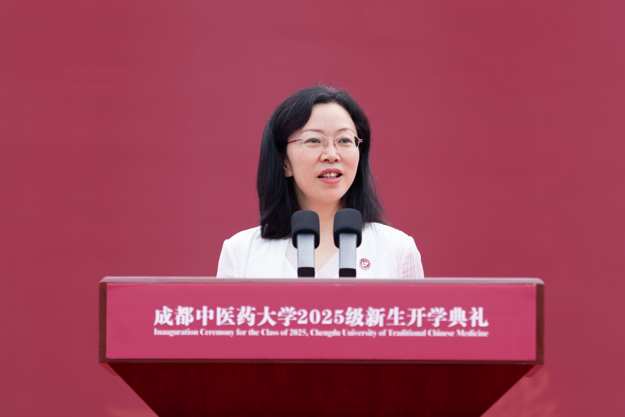 曾芳发表《于沉潜中积蓄力量,在坚守里孕育新生》主题讲话,向携梦而来的莘莘学子致以热烈欢迎:走进成中医,是走进一所传授岐黄智慧的学府;叩开成中医的大门,是叩开一座勇探学术本真的殿堂;置身成中医,是置身于一片心系苍生福祉的杏林;拥抱成中医,是拥抱一座融通文明精粹的桥梁。