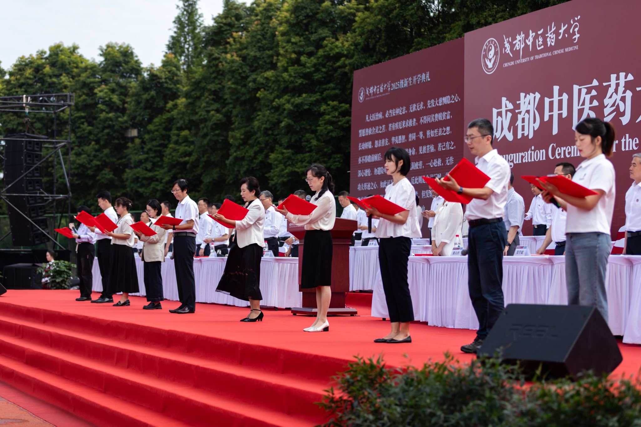 典礼的最后,跟随学校全国三八红旗手、全国模范教师、四川省“四有好老师”等优秀教师代表,校友代表,在校本科生代表,留学生代表的领诵,全体师生一同诵读中医经典《大医精诚》片段,传承古今医者顶礼尊崇之言、求学问道之本。