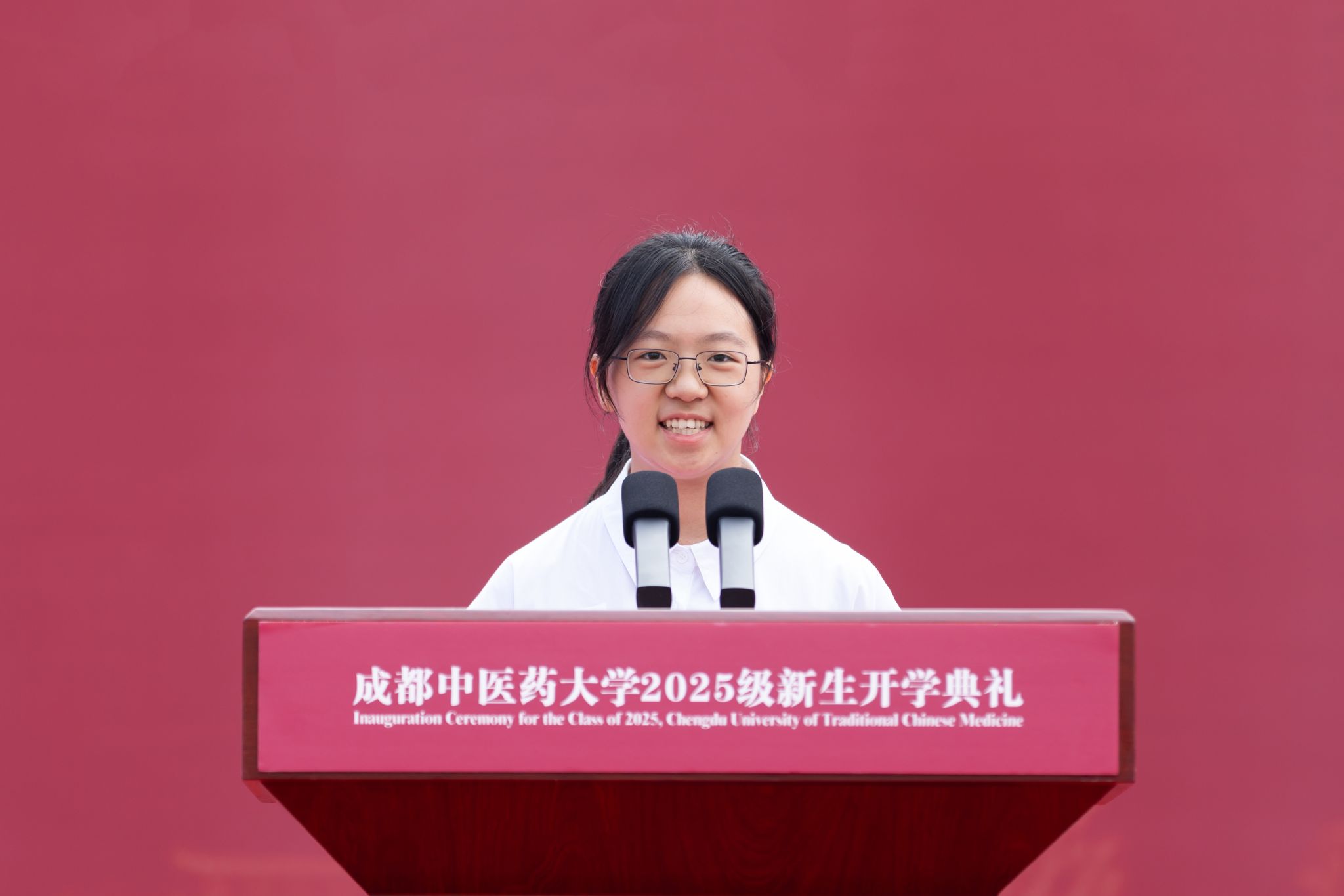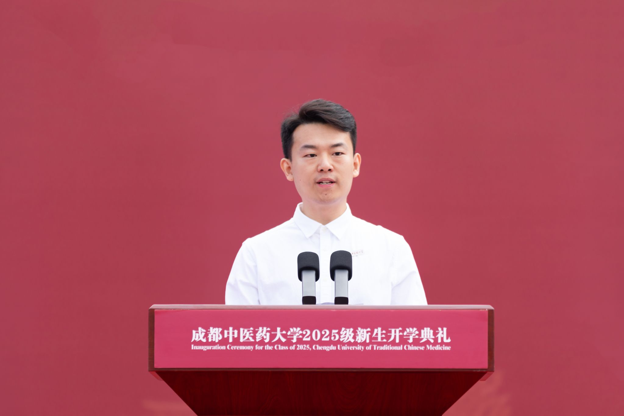 2025级九年制中医学(李斯炽班)新生苏展悦代表新生发言,立志做经典的传承者、创新的开拓者、文化的传播者。号召全体新同学以敬畏之心、勤勉之志、仁爱之心开启在成中医的学习与实践,仰望星空、脚踏实地,积极投身于国家中医药事业的未来中。