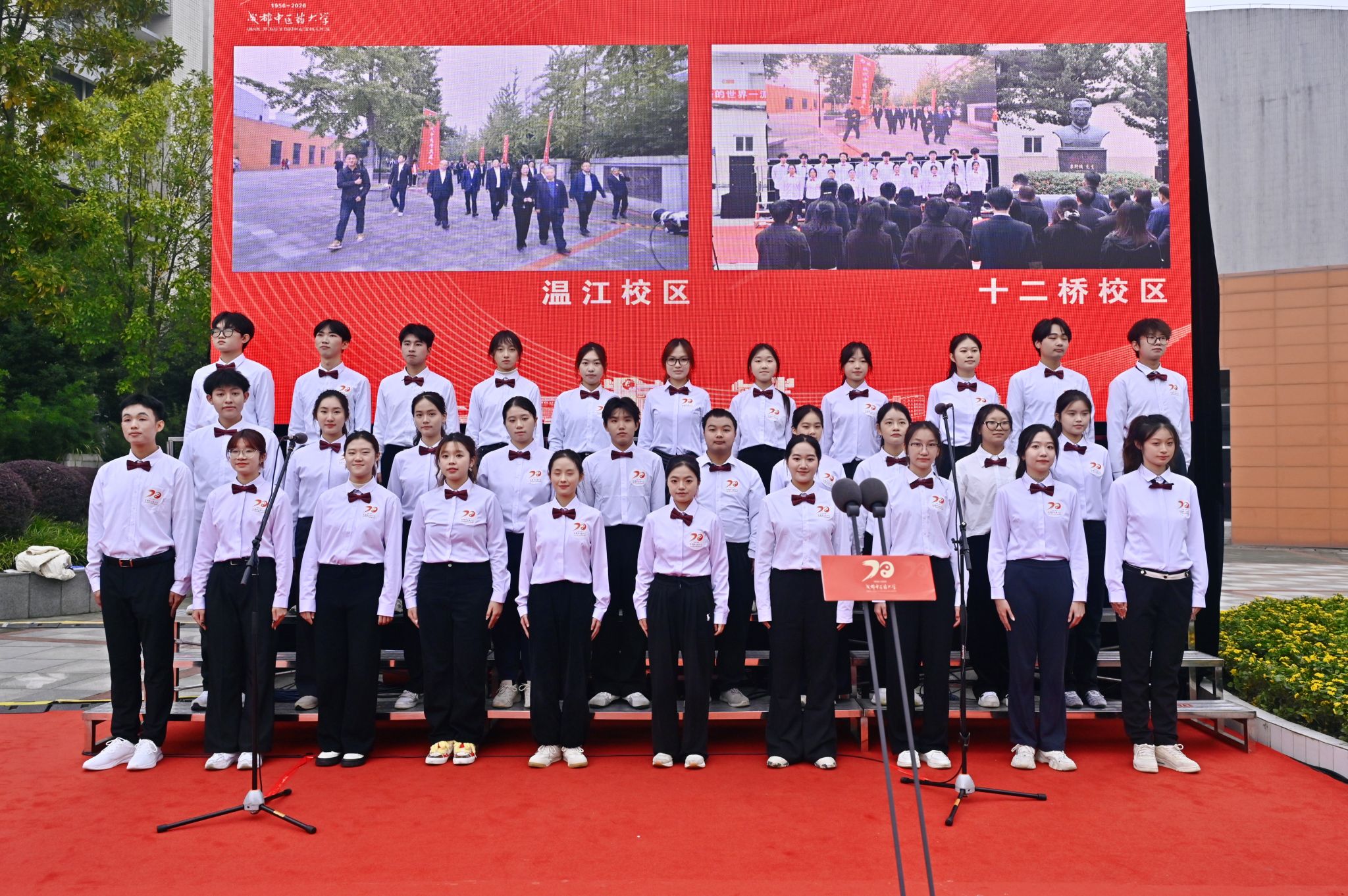 米银军、廖飞、张泽钧、曾芳、白礼西、谢恬、梁益建、谢春光以及学生代表黎欣雨共同启动建校70年倒计时一周年。