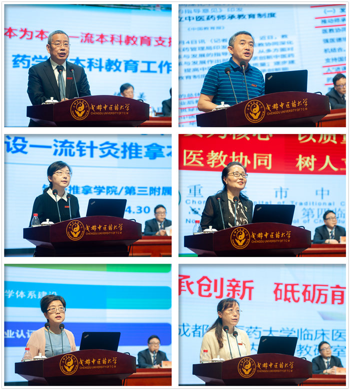 学院代表、教学实习基地代表、教研室代表分别从教学改革与成果、中医传承教育、一流专业建设、中医学临床一体化班、医教协同、标杆教研室建设等方面进行交流发言。