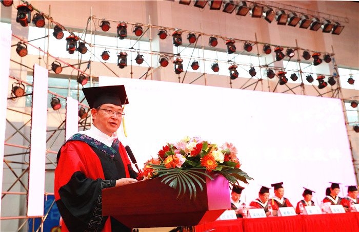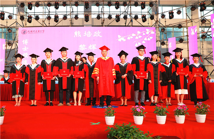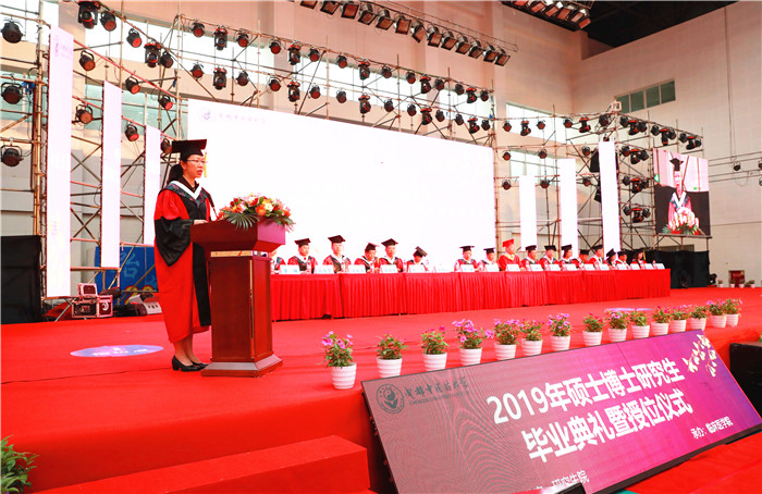 典礼开始前,全场人员起立,齐唱中华人民共和国国歌。刘毅为毕业典礼暨授位仪式致辞。刘毅以“以才立业,以德立身,德才兼备,知行合一”为题,希望毕业的学子秉持成中医“乐学、善思、求本、创新”的学风,夯实学识、勇于实践,锤炼本领、敢于创新,勇担承继中医药传统、创新中医药发展的重任,勉励同学们“欲带冠冕,必承其重”。刘毅强调,必须严守科研伦理规范,守住学术道德底线,“无物不诚,诚外无物”。