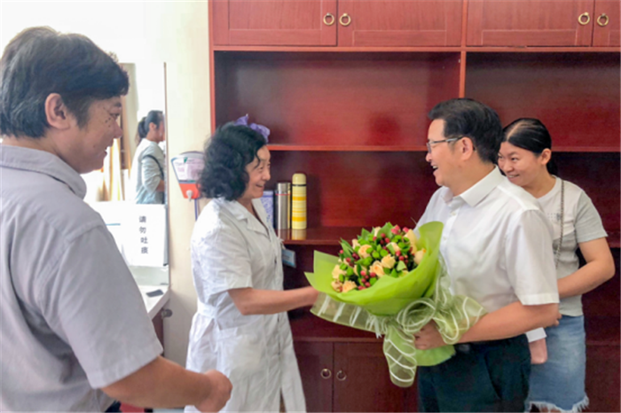 学校党委书记刘毅走访了神经内科病房、消化科和肾病科、皮肤科,看望了科室医护人员代表及退休老专家,并为他们送上了鲜花和节日祝福。刘毅感谢他们在节假日依然坚守一线,希望大家能不忘初心,砥砺前行,共创一流。
