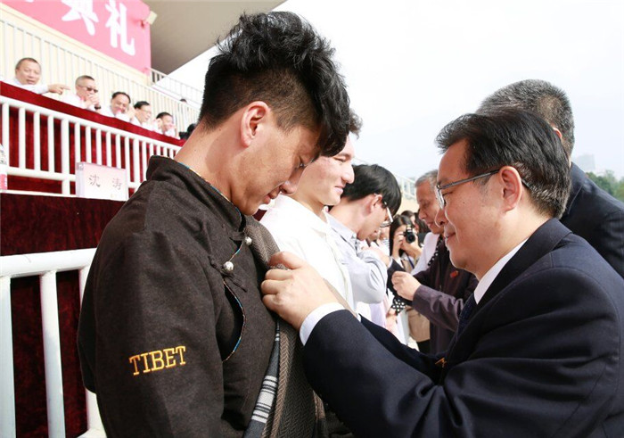 在激昂的校歌歌声中,校领导和以首届国家级教学名师、中药学专家万德光教授为首的十多名教师代表一起为25名新生代表佩戴上校徽,寄寓着学校对同学们传承岐黄薪火、发扬成中医精神的期望。