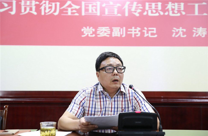 党委副书记沈涛领学习近平总书记在全国宣传思想工作会议上的重要讲话精神。他用“一个指导”“一个中心环节”“五项使命任务”“九个坚持”“四个必须”“一个战略任务”“三个不”“三个风”“四个讴歌”“四个观”“三个讲”以及“讲好三个故事”等关键词深刻解读习近平关于做好新形势下宣传思想工作的最新指示。强调要把习近平总书记重要讲话作为新形势下加强宣传思想政治工作的行动指南和根本遵循,以新时代中国特色社会主义思想和党的十九大精神为指导,增强“四个意识”、坚定“四个自信”,自觉承担起举旗帜、聚民心、育新人、兴文化、展形象的使命任务,坚持正确政治方向,在基础性、战略性工作上下功夫,在关键处、要害处下功夫,在工作质量和水平上下功夫,推动宣传思想工作不断强起来,促进全体人民在理想信念、价值理念、道德观念上紧紧团结在一起,为服务党和国家事业全局作出更大贡献。