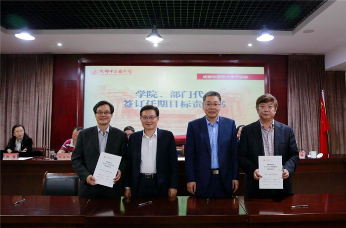 校党委书记刘毅和余曙光与作为代表的6个学院、4个部门的领导签订任期目标任务书。其他学院、部门领导班子的任期目标任务书将在会后将由党委组织部牵头落实签订。