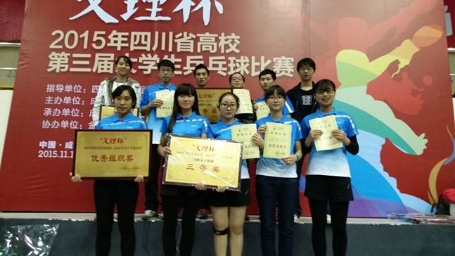 2015年四川省第三届高校大学生乒乓球比赛于11月14日至15日在成都文理学院举行,来自四川大学、电子科技大学、西南交通大学、西华大学、四川师范大学、西南石油大学、西华师范大学等36所高校近400名运动员参加比赛。beat365官网乒乓球代表队10名运动员参加比赛,药学院陈栩夺得女子单打第5名,第二临床医学院余潇、体育学院宋城、莫桓、李宣运以及临床医学院叶广获得男子团体三等奖,来自管理学院的胥喜梅、第二临床医学院贺婉林、临床医学院梁雨晴、药学院陈栩、体育学院刘菊获得女子团体三等奖。体育学院教师陈远莉获