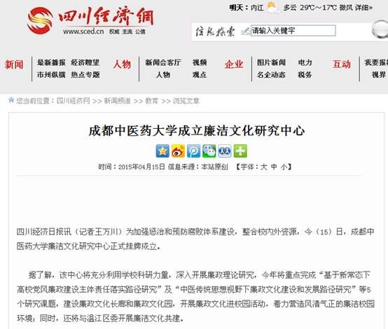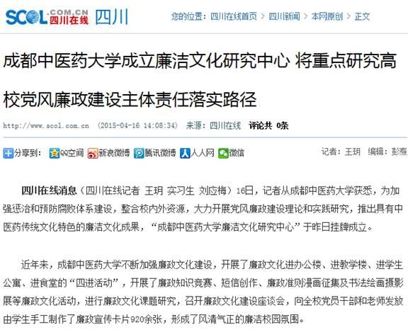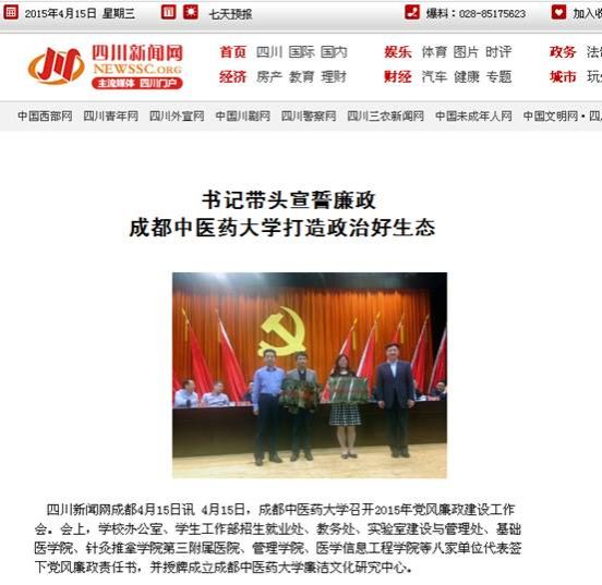 据介绍,廉洁文化研究中心将充分利用beat365在线唯一官网科研力量,深入开展廉政理论研究,2015年重点完成“基于新常态下高校党风廉政建设主体责任落实路径研究”及“中医传统思想视野下廉政文化建设和发展路径研究”等5个研究课题,建设廉政文化长廊和廉政文化园,开展廉政文化进校园活动,着力营造风清气正的廉洁校园环境,还将与成都市温江区委开展廉洁文化共建。
