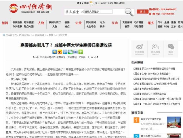 学校党委宣传部近期策划了《寒假都去哪儿了?——各学院同学寒假归来话收获》和《师生摆两会——全校师生关注并热议2015年全国“两会”》两个新闻专题,四川经济网于3月15日大篇幅报道了学校同学寒假归来话收获和全校师生关注全国“两会”情况。以下是报道情况: