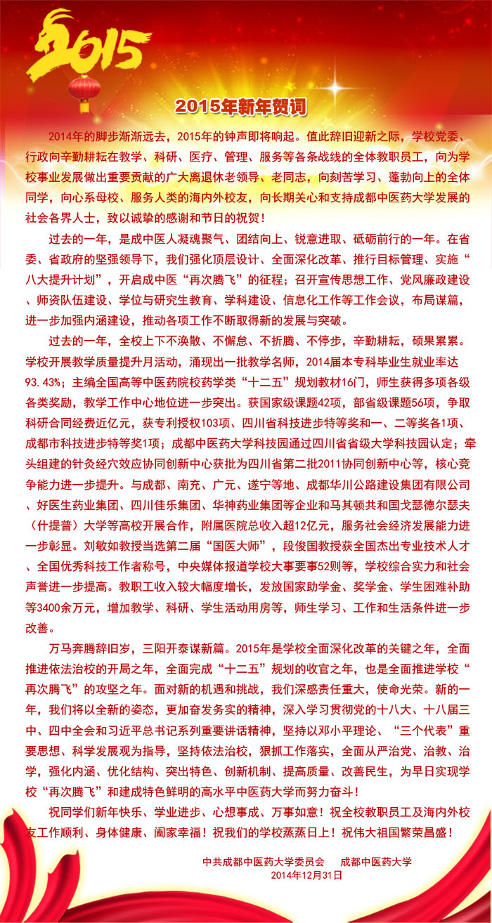 2015年新年贺词 发布时间:2014-12-31 16:36:00 浏览次数: 次 【字体:小 大】 【打印正文】 上一条:2015年新年贺词 下一条:离退休党委召开学习党的十八届四中全会精神暨年终总结会