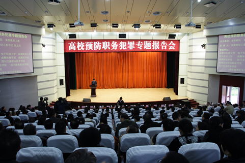 11月8日上午,结合党的群众路线教育实践活动和全省开展的正风肃纪活动,由省检察院、省委教育工委举办的高校预防职务犯罪专题报告会在beat365官网温江校区百会堂举行,对党员干部进行法纪宣传、警示教育。来自beat365在线唯一官网、电子科技大学、西南财经大学、四川农业大学、成都体育学院等在蓉的11所高校分管基建的校领导,学校职能处室、二级院系干部共380余人参加报告会。 beat365官网全体在家校领导、处科级以上领导干部及规建、人事、设备、财务、后勤等重点岗位责任人180余人参加了会议。
