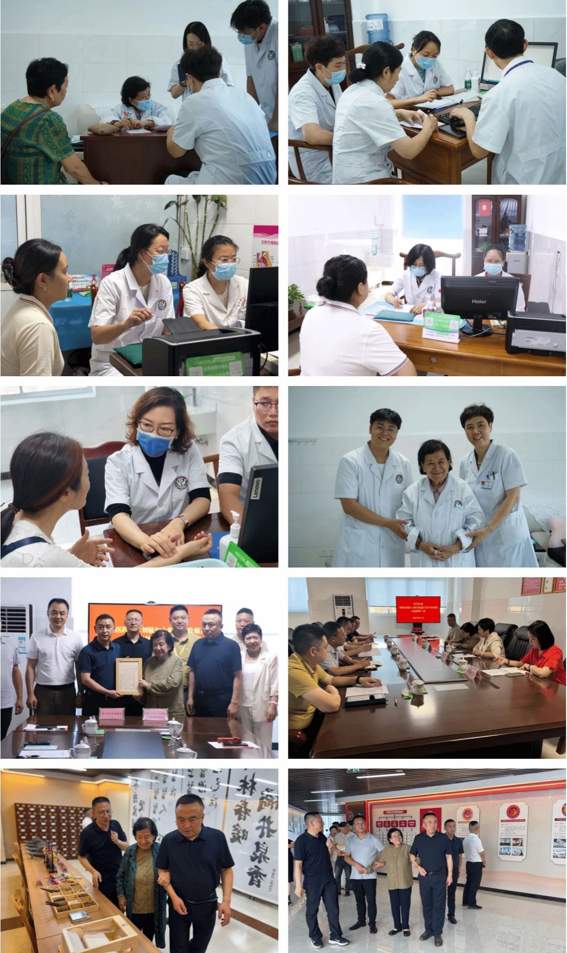 刘敏如及其专家弟子团队在县中医医院开展义诊活动,为患者问诊、把脉、开处方,提出治疗方案与中医养生保健方法,并指导跟师弟子分析病症原因、用药方案,传授中医诊治逻辑。