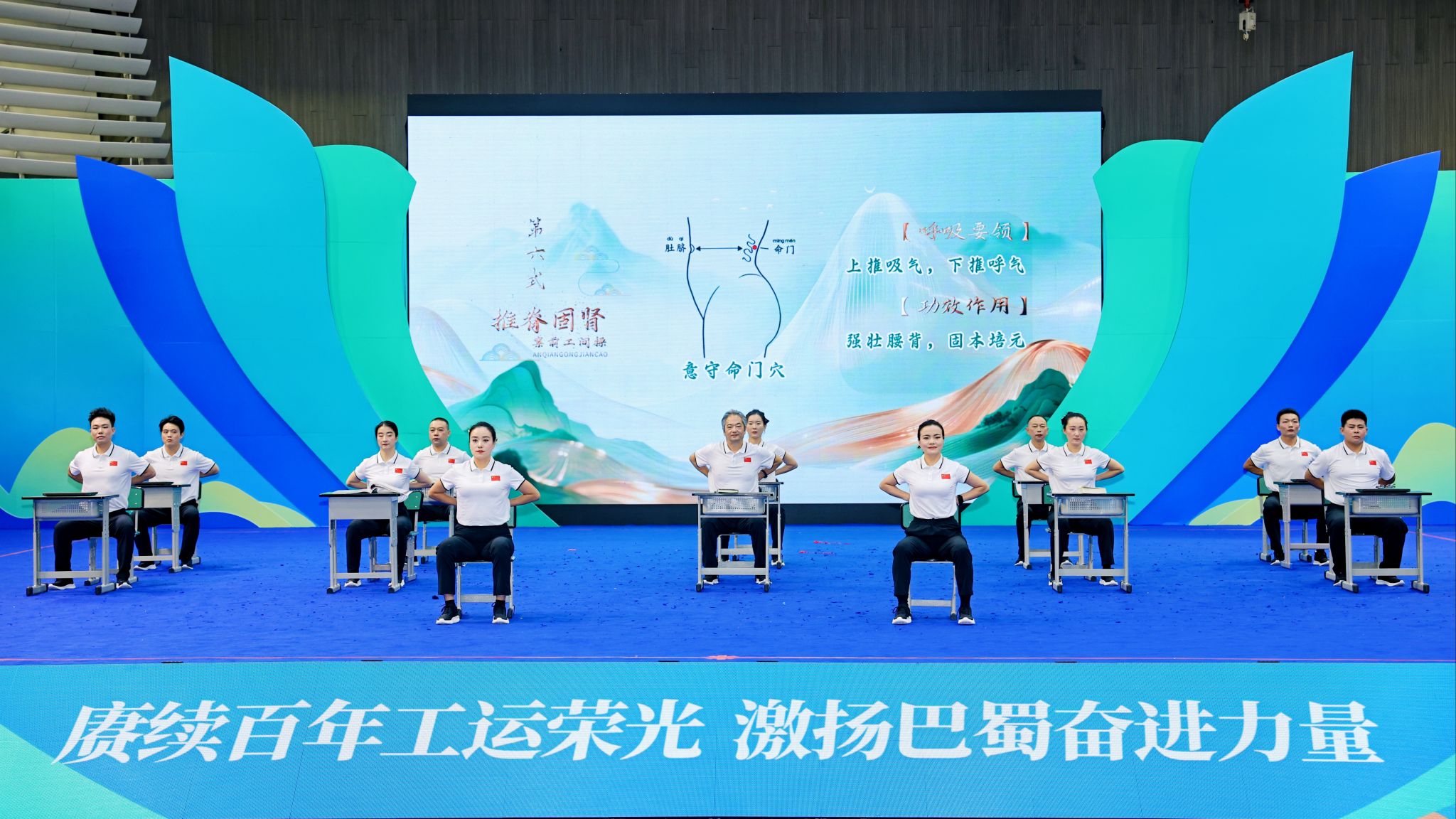 在健身操项目中,队员们展示了由邬建卫教授团队自主编排的“案前工间操”。这套操法将中医导引术与健身功法巧妙结合,针对教职工久坐办公特点量身打造,体现中医因时、因地、因人制宜理念,其科学性、实用性和创新性获得了新闻媒体关注和现场观众的广泛好评。