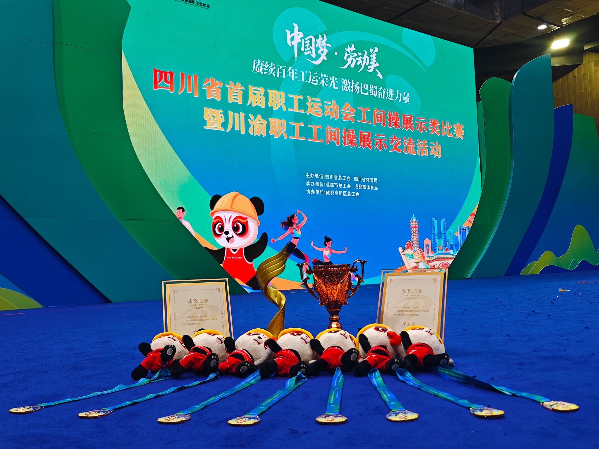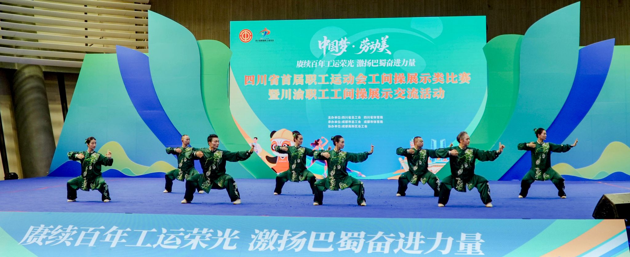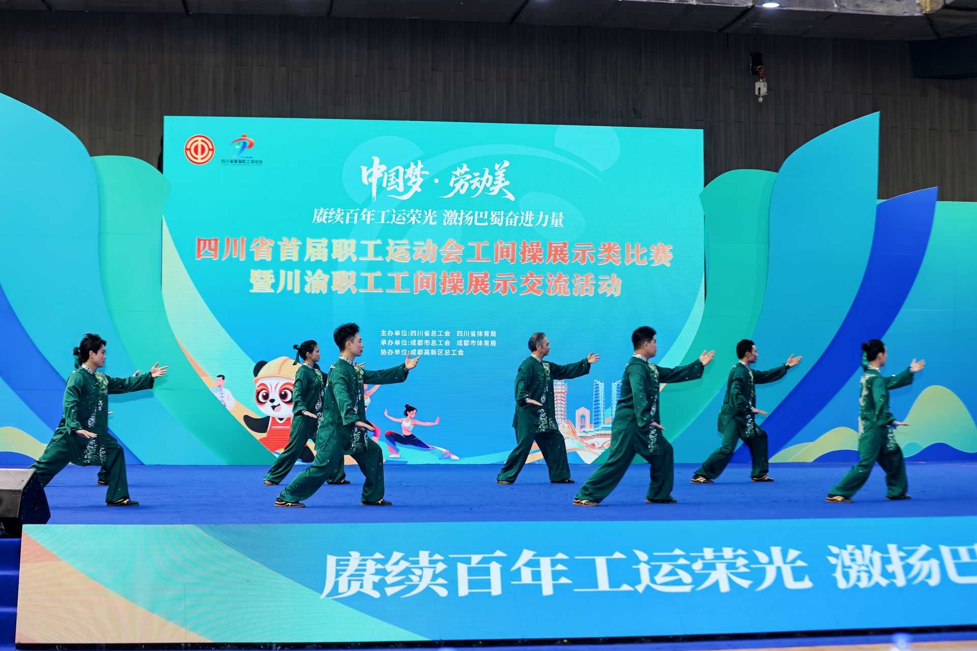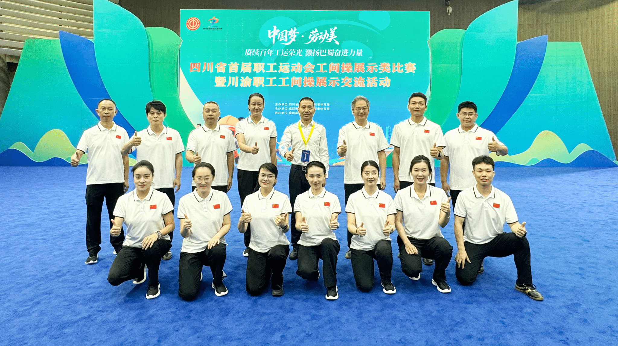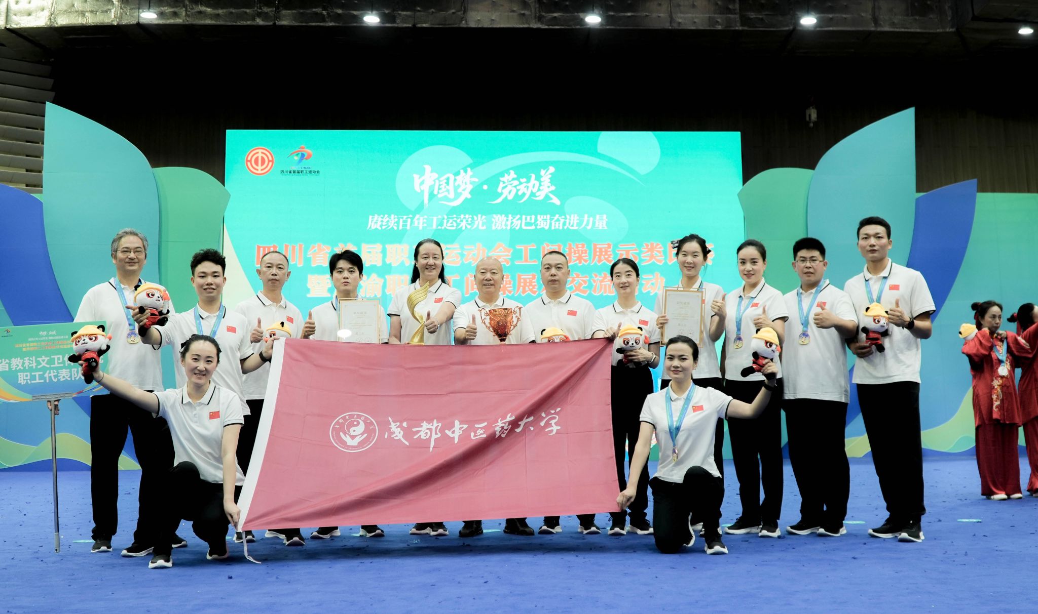 9月17—18日,四川省首届职工运动会工间操展示类比赛在成都高新体育中心举行。本次大赛由四川省总工会、四川省体育局联合主办,以“中国梦·劳动美——赓续百年工运荣光 激扬巴蜀奋进力量”为主题,吸引了来自全省各市(州)总工会、省产业(局)、企业集团(公司)工会等共51支参赛队近千人同台竞技。由beat365官网工会牵头组建的教职工队伍代表四川省教科文卫体系统出征,经过激烈角逐,荣获团体第三名。