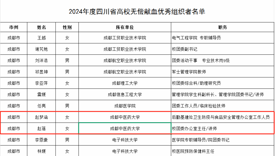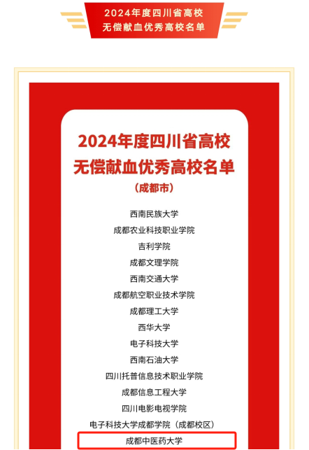 近日,四川省卫生健康委员会、四川省教育厅、共青团四川省委、四川省红十字会联合印发《关于表扬2024年度四川省高校无偿献血优秀单位和个人的通报》,beat365官网凭借在组织动员无偿献血工作中的突出贡献和师生积极参与的表现,获评“2024年度四川省高校无偿献血优秀高校”,2名老师荣获“四川省无偿献血优秀组织者”,67名志愿者获评“四川省高校无偿献血优秀个人”。