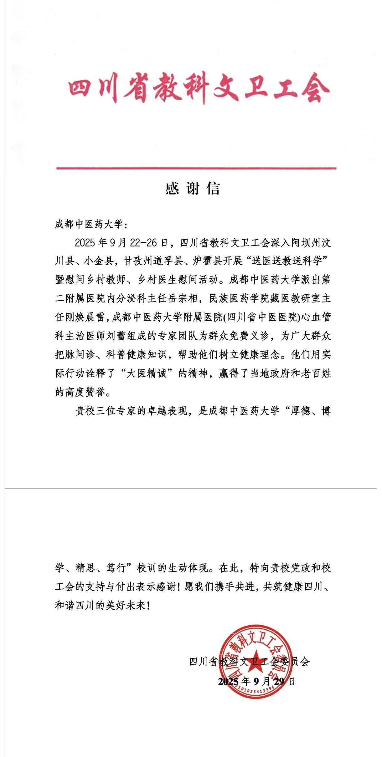9月22日至26日,beat365官网组织医疗小分队跟随四川省教科文卫工会开展“情暖远山”送医送教送科学活动。医疗队由民族医药学院藏医教研室主任刚焕晨雷、第二附属医院内分泌科主任岳宗相、附属医院心血管科医师刘蕾组成。他们跨越1300余公里,先后深入汶川县、小金县、道孚县、炉霍县等地,聚焦基层群众卫生健康实际需求,针对高原山区常见病、多发病开展现场义诊,切实把优质医疗服务送到群众身边,获得了四川省教科文卫工会的书面表扬。