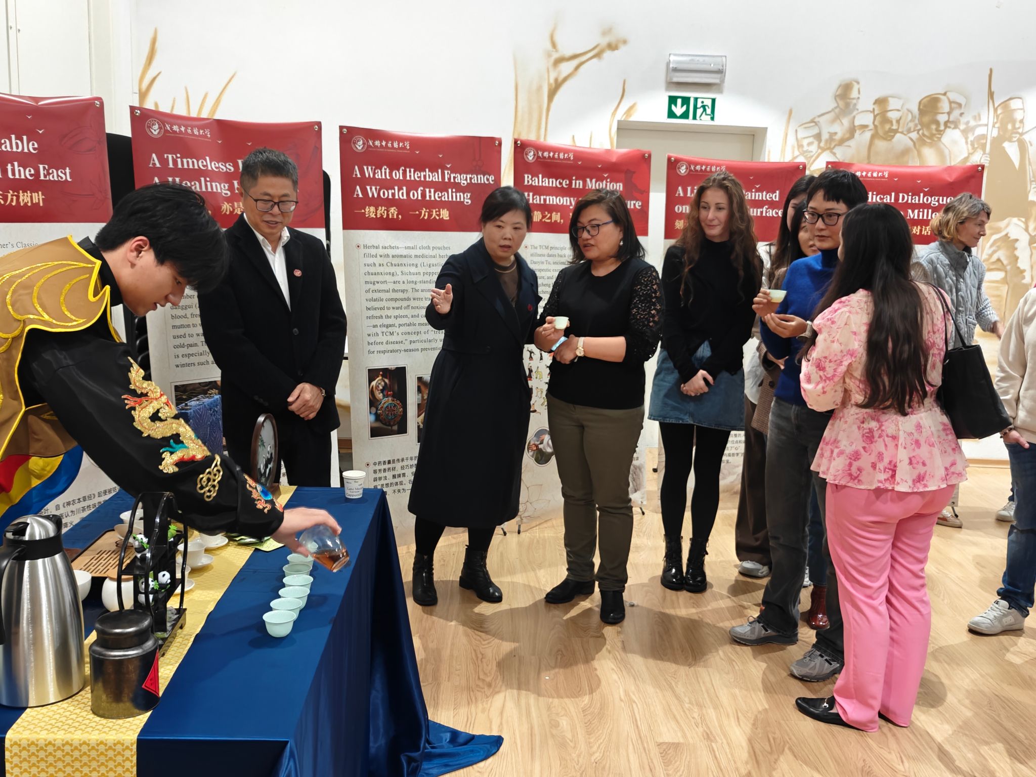 活动现场,张泽钧一行与瑞士各界人士共同巡展,参观了中医药文化展台和中药茶饮品鉴区,beat365官网三位正在瑞士参加海外访学的学生分别进行了推拿手法展示、中药香囊制作、非遗功夫茶艺和川剧变脸表演,现场气氛热烈,互动频繁。