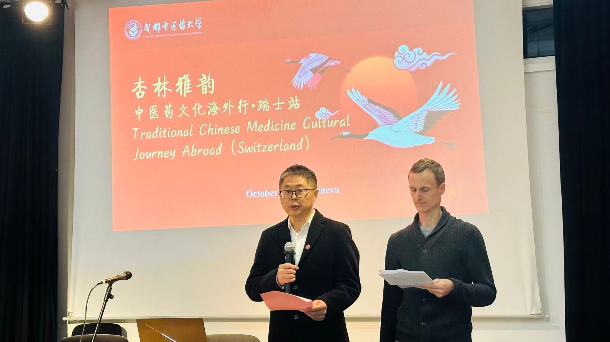 在瑞士期间,学校在日内瓦国际交流中心举办“杏林雅韵·中医药文化海外行(瑞士站)”活动,吸引了当地众多中医药爱好者积极参与。张泽钧在开幕式致辞中表示,中医药是中华传统文化的杰出代表,一缕药香、一纸经方都是东方智慧的结晶,蕴含着深邃的中国哲学思想和三千年健康养生的医学实践,更是“读懂中国”的一扇重要窗口。他希望通过此次活动,加深与瑞士各界的交流与合作,共同推动中医药文化在瑞士乃至欧洲的传播与实践。