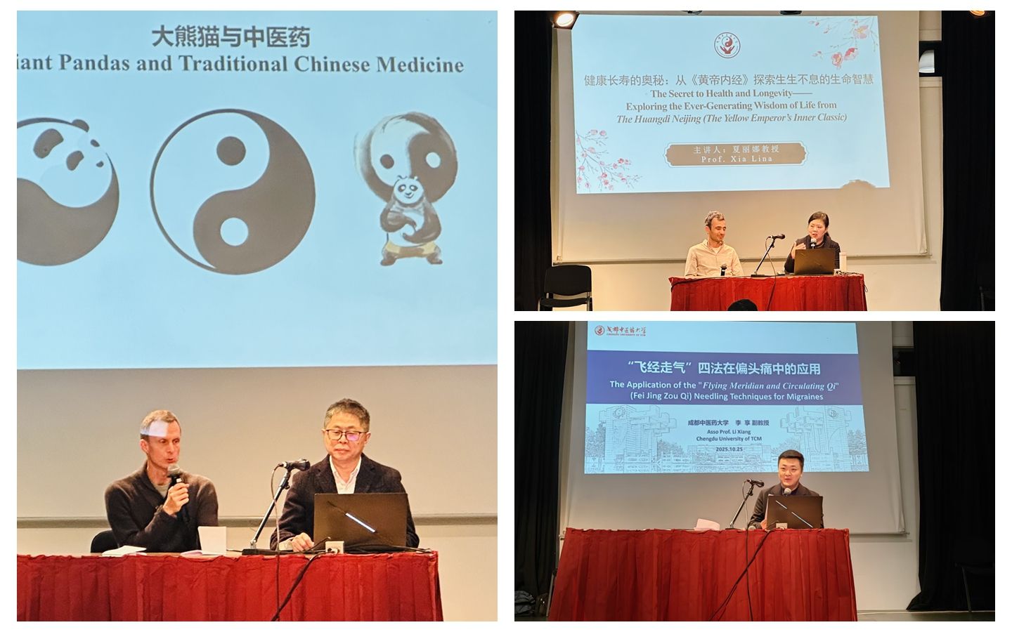 在学术交流环节,张泽钧教授聚焦中国“国宝”大熊猫,全面介绍了我国在大熊猫保护与研究领域取得的重大成就,生动讲述大熊猫与中医药在生态保护、生命哲学、可持续发展等方面的共通智慧。夏丽娜教授以《黄帝内经》中蕴含的生生不息生命智慧为引,围绕健康长寿的奥秘和常见亚健康状态与常见慢性病的养生,详细阐释了中医四时养生观和“治未病”的核心理念与实践路径。李享副教授聚焦针灸古典针法的现代应用和针灸优势病种的临床研究进展,深入浅出地展示了针刺疗法在痛证疾病管理领域的独特疗效与科学内涵。