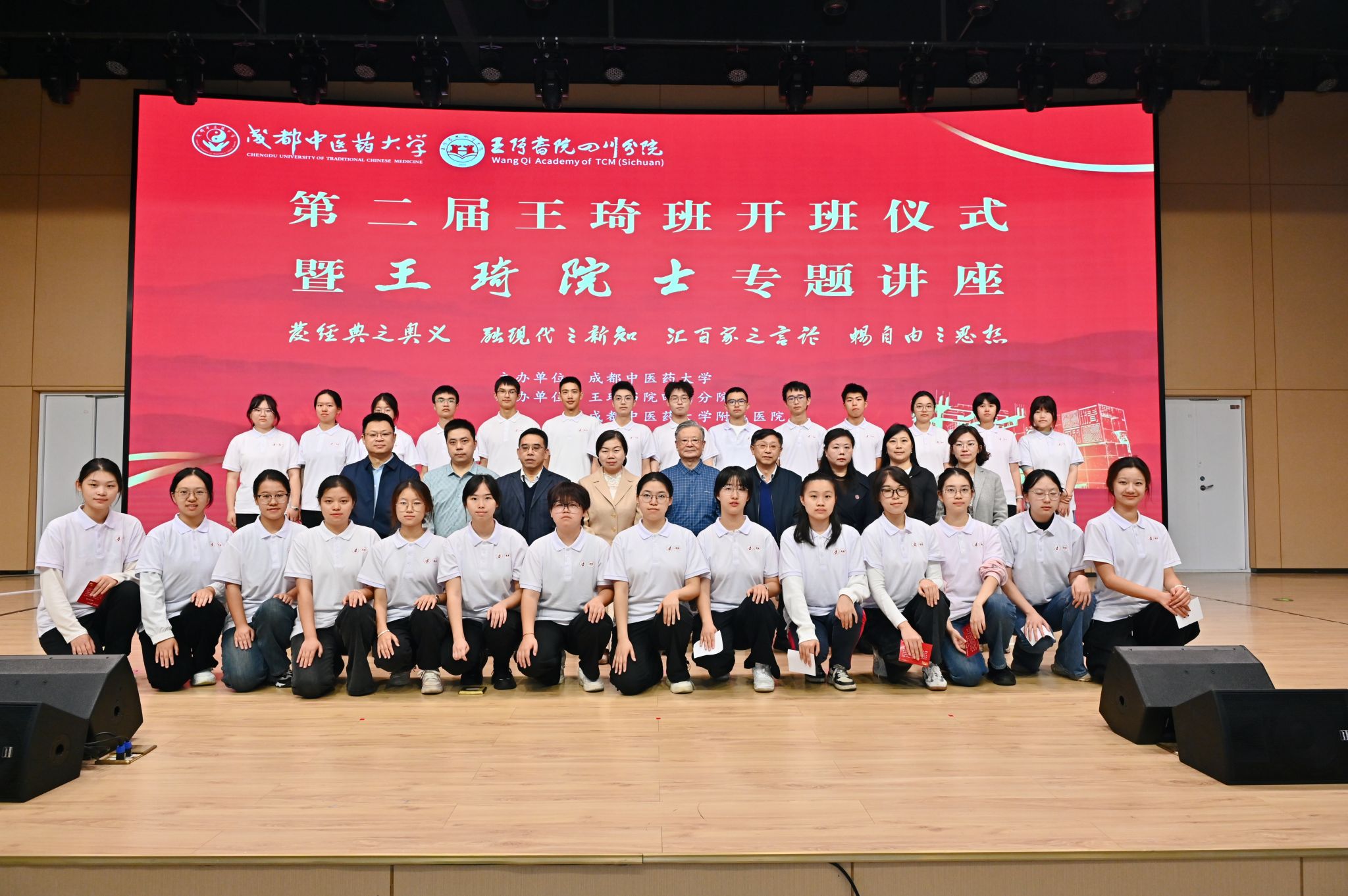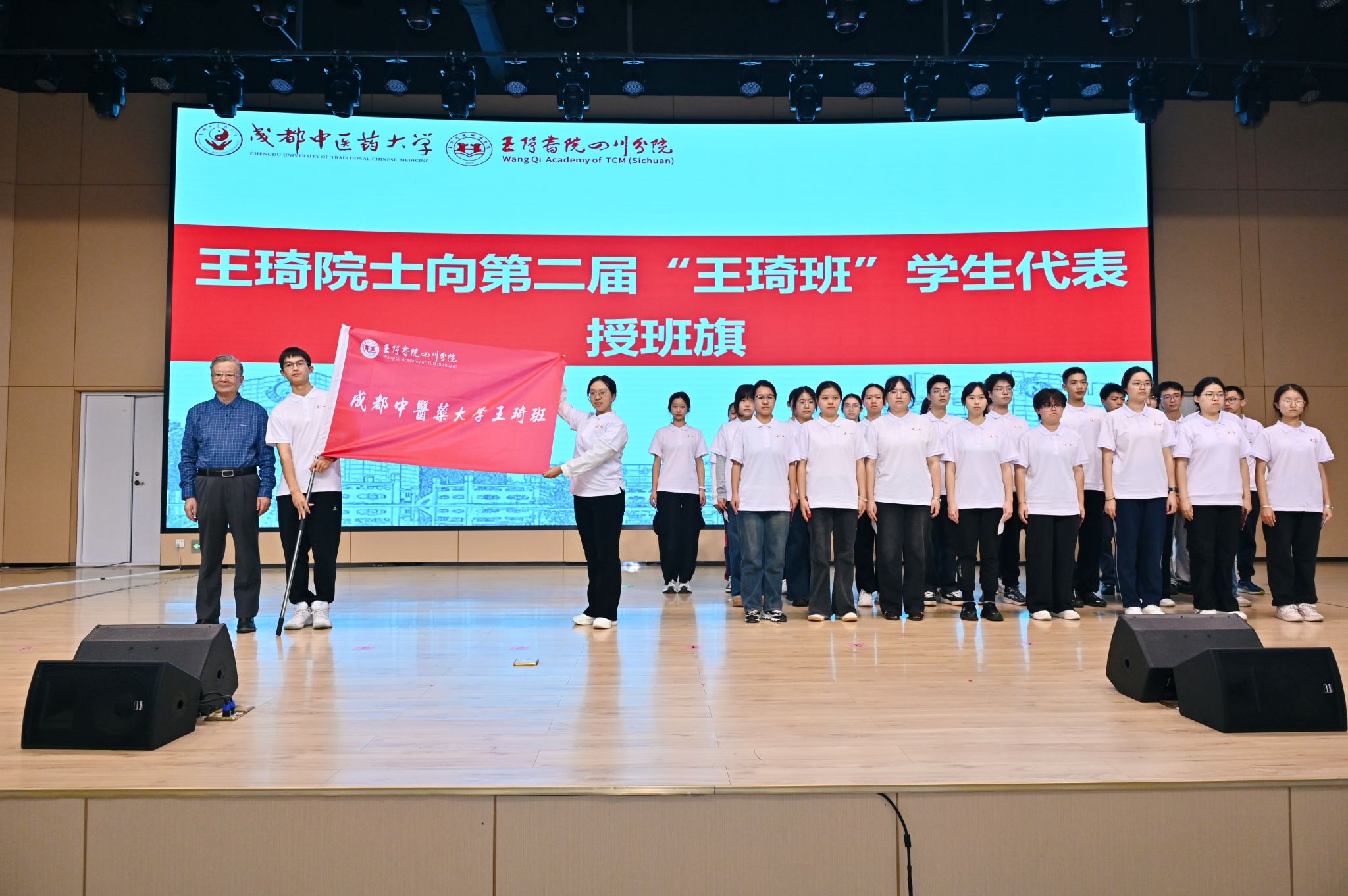 王琦院士亲自向第二届“王琦班”学生代表授予象征传承与责任的班旗。这面班旗凝聚着大师的期许与师生的信念,标志着“王琦班”学术精神的接力传承。在全体师生的见证下,师生共同诵读《师承论》选段,以经典之声致敬中医薪火相传的师道传统。