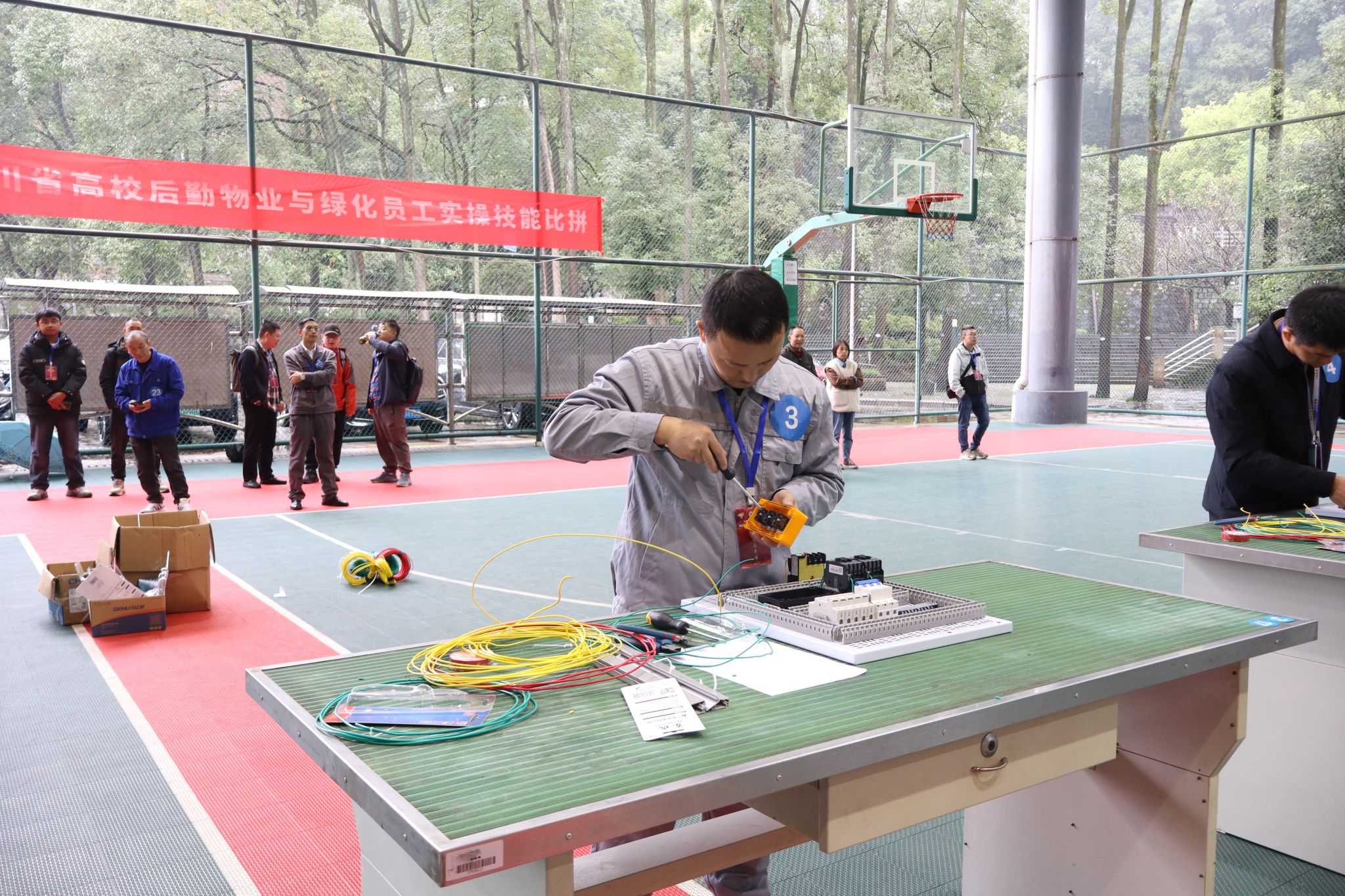 决赛现场,两位选手凭扎实功底与冷静应战尽展风采。吴东在电工实操环节,电路安装、故障排查、安全规范一气呵成,展现技术硬实力;江忠强准确识别植物病虫害,修剪造型兼顾美观与安全,尽显后勤工匠本色。