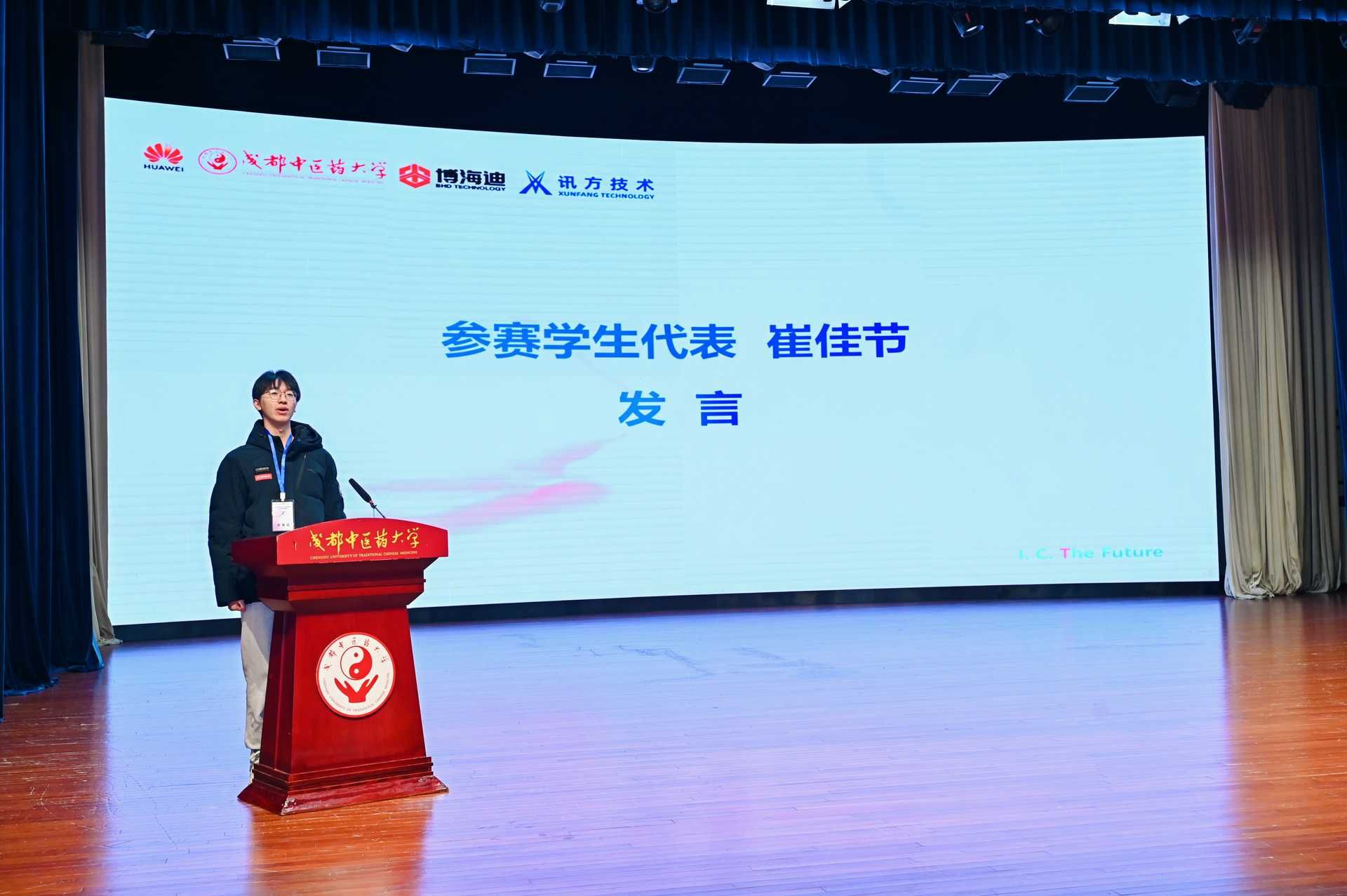 电子科技大学学生崔佳节作为参赛代表发言。他表示,华为ICT大赛是连接理论知识与实际应用的关键桥梁,让青年学子得以通过前沿技术实践,深入理解并参与塑造数字时代的未来。他号召全体学子将个人技术理想融汇于时代发展,用代码回应国家在核心领域的召唤,以技术之力,筑时代之基。