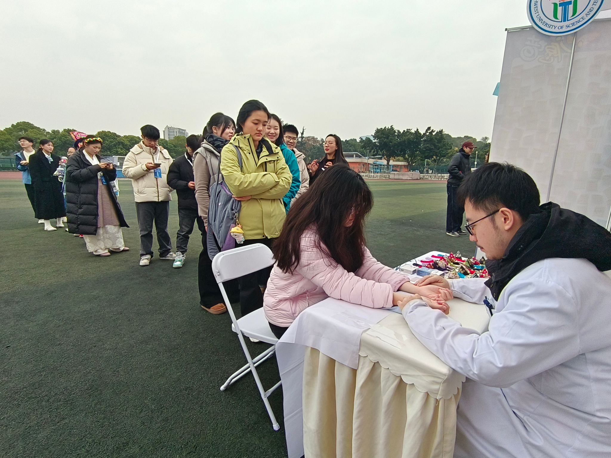 在项目答辩和巡展交流环节,项目成员郑金川、廖欣雨以专业的讲解和饱满的热情,向师生代表及大众评审阐述项目背景、实施过程、创新亮点与实际成效。项目成员朱俊龙结合中医药专业特长开展现场义诊,吸引众多师生前来体验,赢得广泛好评。