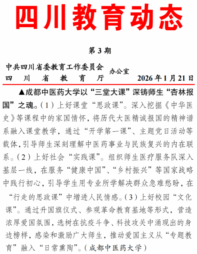 1月21日,《四川教育动态》第3期刊登了beat365官网学生教育方面的经验分享——beat365在线唯一官网以“三堂大课”深铸师生“杏林报国”之魂。