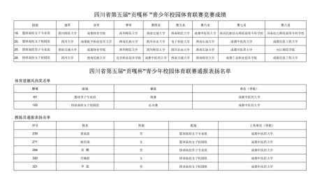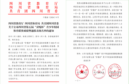 近日,四川省教育厅、省体育局与共青团四川省委联合印发《关于公布四川省第五届“贡嘎杯”青少年校园体育联赛成绩暨通报表扬名单的通知》(川教函〔2026〕9号),对联赛中表现优异的集体与个人进行表彰。学校参赛团队在本届“贡嘎杯”中斩获佳绩,篮球、排球项目教练团队双双荣获通报表扬。