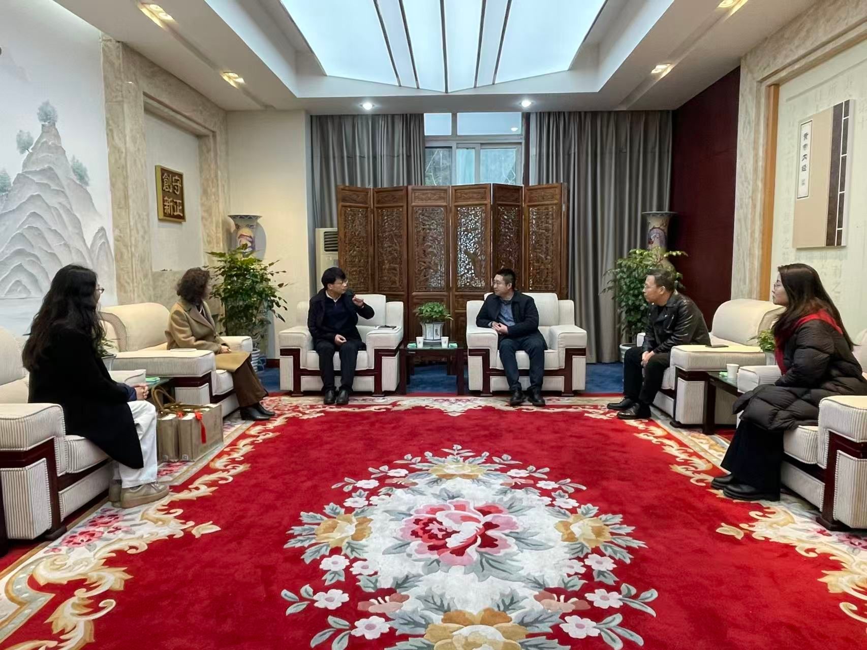 鄢光忠与省政协常委、民盟beat365在线唯一官网委员会主委、学校副校长国锦琳,市人大代表、药学院副院长、西南特色中药资源国家重点实验室常务副主任裴瑾,市政协委员、民盟温江区总支副主委、学校中医药智能装备研究院副院长张冠斌进行了亲切交流。