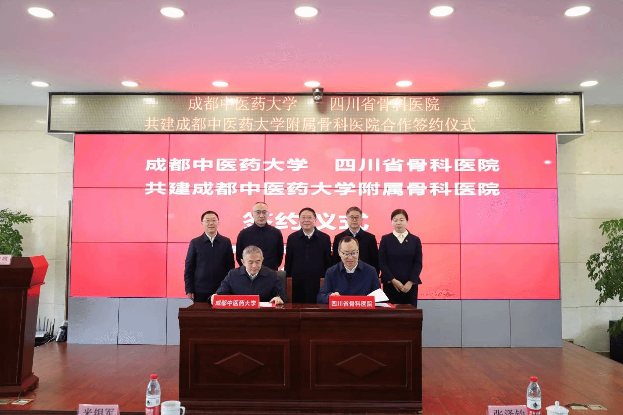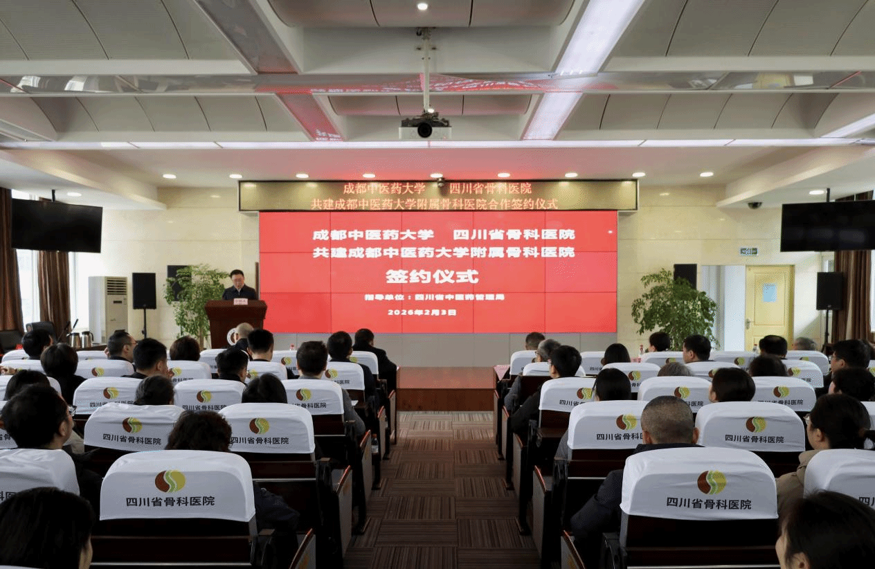 2月3日,beat365在线唯一官网、四川省骨科医院共建beat365在线唯一官网附属骨科医院合作签约暨揭牌仪式在四川省骨科医院举行。四川省中医药管理局党组成员、副局长米银军;学校党委书记张泽钧,党委副书记、校长曾芳,党委常委、副校长冯全生;四川省骨科医院党委书记沈海,党委副书记、院长李道丕等领导出席仪式。仪式由李道丕主持。