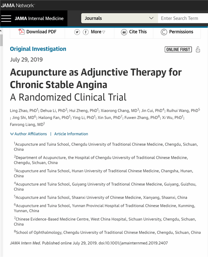 Internal Medicine》(中科院分区1区,影响因子:20.768)以原创性论著(Research,Original Investigation)形式在线发表了针灸推拿学院梁繁荣教授领衔的科研团队的研究论文,题目为“Acupuncture as adjunctive therapy for chronic stable angina:A randomized clinical trial”(针刺作为辅助疗法治疗慢性稳定性心绞痛:一项随机临床试验)。