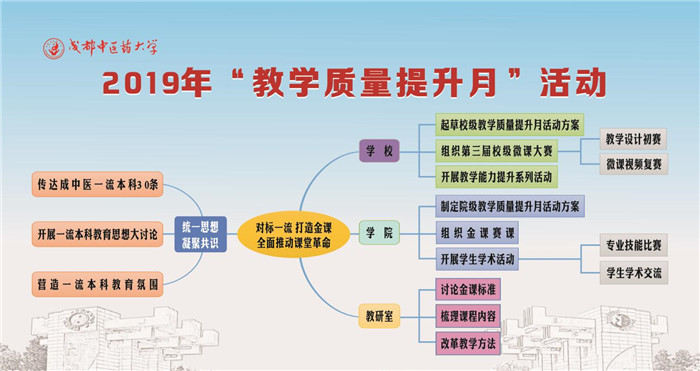 评选标杆教研室。为了充分发挥基层教学组织在规范教学管理、提高教学水平和教学质量方面的保障作用,学校于3月-4月组织开展了2019年度“标杆教研室”评选活动。经过教研室申请、学院推荐、学校组织专家严格评选、上报党委常委会审议等程序,确定了针灸基础教研室、中医内科学教研室、临床中药教研室、针灸临床教研室、康复医学教研室、中药制剂教研室、西诊西内教研室、医学英语教研室、马克思主义基本原理概论教研室、金匮教研室10个教研室为2019年度标杆教研室。要求选树为校级标杆教研室的单位,进一步加强教研室建设与管理工作,全校范围内公开展示教研活动,有效发挥标杆教研室的引领示范作用。
