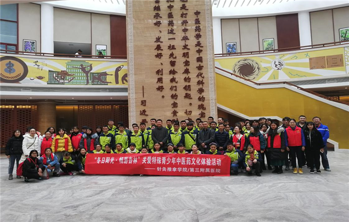 2018年11月30日,为进一步传播中医药文化,发挥中医院校志愿者活动的育人特色,针灸推拿学院/第三附属医院在温江校区携手成都市特殊教育学校成功开展了“冬日阳光,畅游杏林”关爱特殊青少年中医药文化体验活动。学院领导、老师及分团委老师和志愿者们带领来自成都市特殊教育学校推拿专业的学生近距离的感受中医药文化的魅力,开启了一段中医药文化之旅。四川电视台全程采访了此次活动。