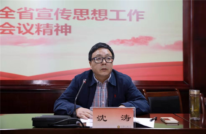 沈涛重点解读了彭清华书记关于做好宣传思想工作做的具体要求,即要牢牢掌握意识形态工作领导权管理权话语权,要旗帜鲜明做大做强主流思想舆论,要着力提高各族群众的思想觉悟、道德水准和文明素养,要加快推进文化小康建设,要大力推动文化产业高质量发展,要全面提升四川对外知名度和美誉度。他还就甘霖以宣传工作“15字”对高校工作的提出的具体要求做了阐述。