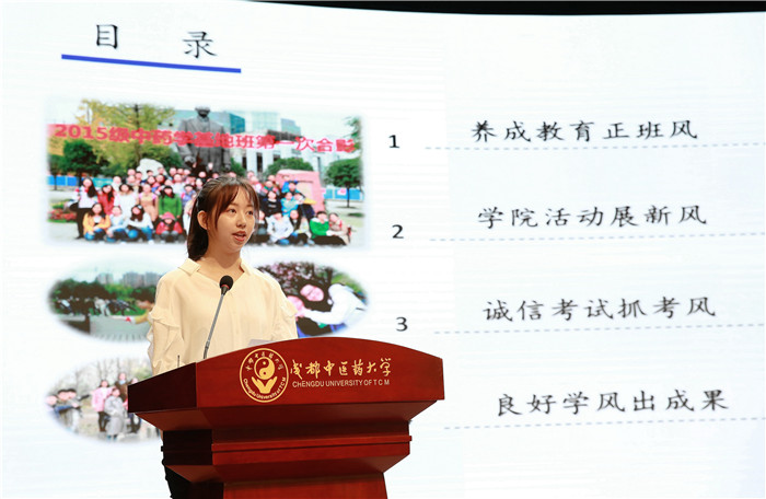 校学生会主席罗婷婷向全校同学发出加强学风建设的倡议。学校优秀班级代表2015级中药基地班和2015级八年制中医学二班也分别进行了班风学风建设交流分享。