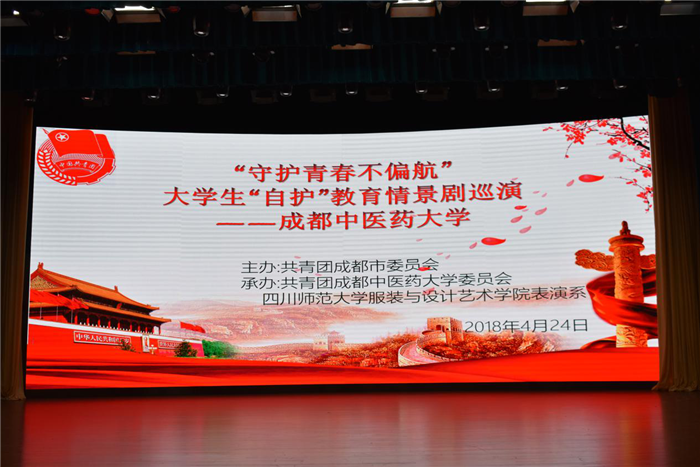 4月24日,为提高大学生自我防范意识,增强自我保护能力,减少大学生上当受骗现象,由共青团成都市委员会主办、beat365官网团委承办、四川师范大学服装与设计艺术学院表演系主演的“守护青春不偏航”大学生“自护”教育情景剧巡演在beat365官网百会堂演播大厅举行。