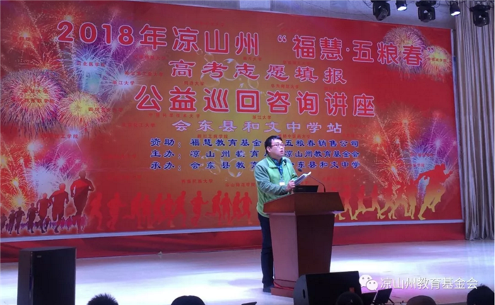3月18日—21日,由凉山州教育局、凉山州教育基金会主办,福慧教育基金会资助的2018年凉山州“福慧·五粮春”高考志愿填报公益巡回咨询讲座在凉山州展开。为帮助凉山州考生更好了解高考志愿填报政策,助力凉山州教育脱贫工作,学校选派了学生处副/招生就业处副处长周茜和杨槐、谢琴、李游三位老师参加此次招生宣讲活动,现场为高三考生分析高考政策和高考形势,一对一指导考生和家长更加精准地填报高考志愿。