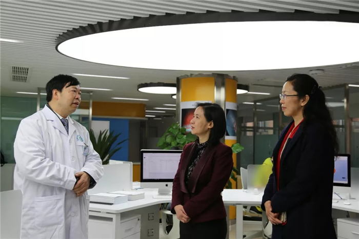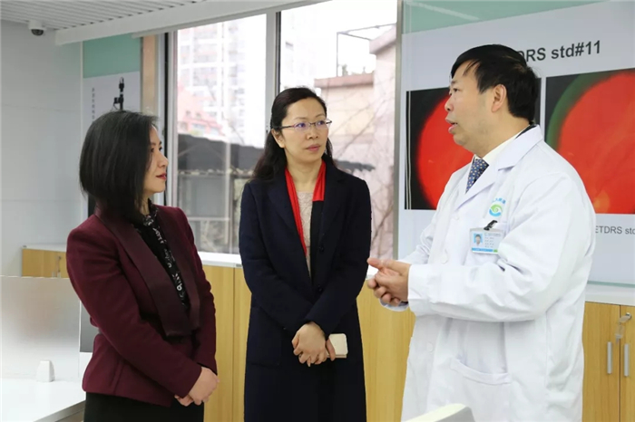 彭翊、杨静一行随后参观了医院眼底读片中心、廖品正国医大师工作室、特检中心、门诊大厅、住院部等。彭翊充分肯定beat365官网通过科技成果转化创新创业成功创办医教研三位一体的研究型眼科医院,认为对高校科技人员创新创业具有示范作用。