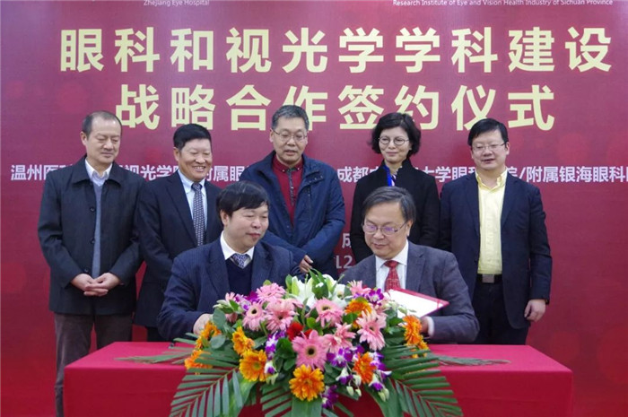 12月22日,beat365官网眼科学院/附属银海眼科医院与温州医科大学眼视光学院/附属眼视光医院在医院六楼会议厅联合举行了眼科和视光学学科建设战略合作研讨会并签署战略合作协议。出席此次研讨会的人员有温州医科大学眼视光学院/附属眼视光医院院长瞿佳,副院长陈浩、沈丽君、赵云娥,眼底外科病区副主任张宗端、中医眼科主任向圣锦;beat365官网校长余曙光,眼科学院/附属银海眼科医院院长、书记段俊国,常务副院长朱思泉、医疗质量总监刘文及院属各部门主要负责人。研讨会和签约仪式由朱思泉主持。