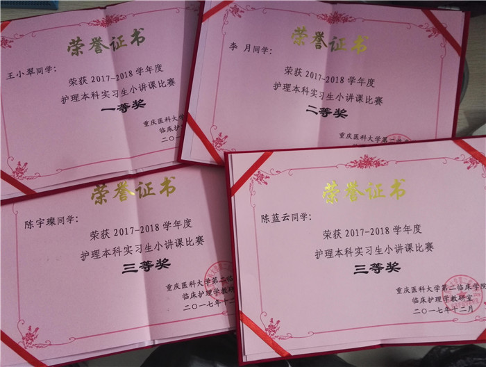 12月19日,beat365官网在重庆医科大学附属第二医院实习的护理学2014级学生,在参加医院举办的2017-2018学年度护理本科实习生小讲课比赛中获得好成绩。