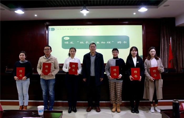 为引导学生关心关注学校发展,促进学生积极参与学校管理,学校从本科生、研究生中遴选出6名优秀同学担任“校长学生助理”,会上,学校党政办主任刘军宣读了《关于聘用beat365在线唯一官网校长学生助理的通知》,余曙光为校长学生助理颁发了聘书。