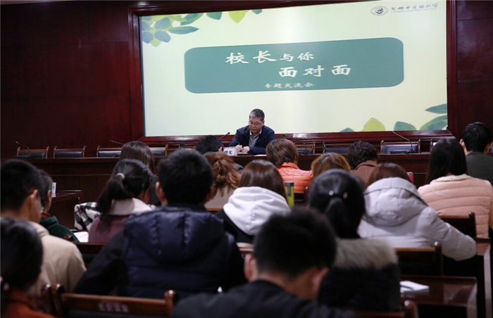 11月22日下午,“校长与你面对面”专题交流会在温江校区第五会议室举行。校长余曙光与150名学生代表进行两个半小时的面对面交流。学校党政办、学生处、教务处、后勤处、校团委等职能部门负责人参加了会议,会议由学生处处长叶军主持。