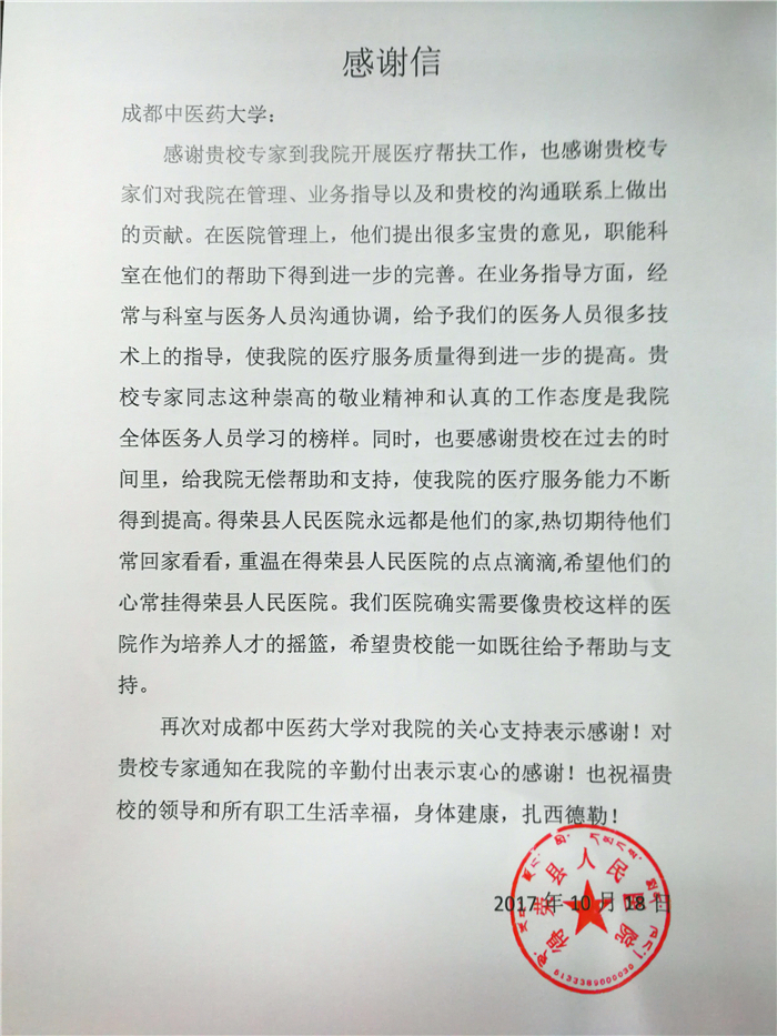 在医疗援建工作结束后,附属医院安排得荣县人民医院工作人员到成都实习进修,并免除他们的进修费用、免费提供住宿,对县人民医院的外科建设给予了大力支持。