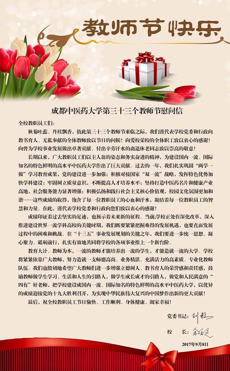beat365在线唯一官网第三十三个教师节慰问信 发布时间:2017-09-08 17:53:00 浏览次数: 次 【字体:小 大】 【打印正文】 上一条:校学生会致全体老师的一封信 下一条:学校召开秋季学期安全稳定信访工作会