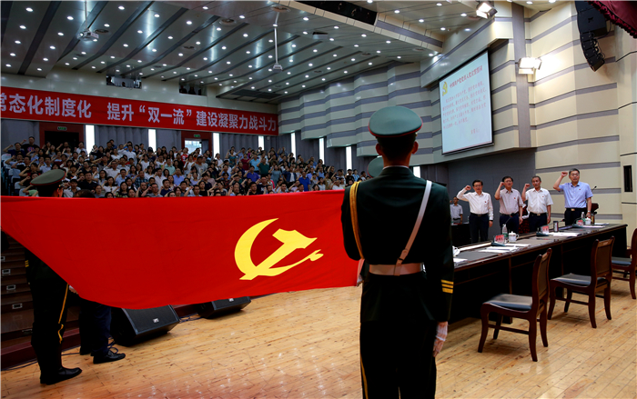 6月29日下午,学校在温江校区召开庆“七一”暨推进“两学一做”学习教育常态化制度化工作会,庆祝中国共产党成立96周年,部署beat365官网推进“两学一做”学习教育常态化制度化工作。会议的主题是:推进“两学一做”常态化制度化,提升“双一流”建设凝聚力战斗力。在家的校领导刘毅、余曙光、彭成、徐廉,中层领导人员,分党委、党总支委员,党支部书记,受表彰的先进基层党组织负责人、优秀党务工作者和优秀共产党员,师生党员代表,民主党派基层组织、侨台联负责人等共计380余人参加会议。学校党委书记刘毅作推进“两学一做”学习教育常态化制度化主题报告。会议由学校党委副书记、校长余曙光主持。