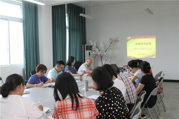 6月8日下午,护理学院党委召开二级中心组专题学习会,学习贯彻四川省第十一次党代会精神和习近平总书记在中国政法大学考察时重要讲话精神。院党委委员及各部门负责人、支部书记参加会议,院党委书记刘世云主持会议。