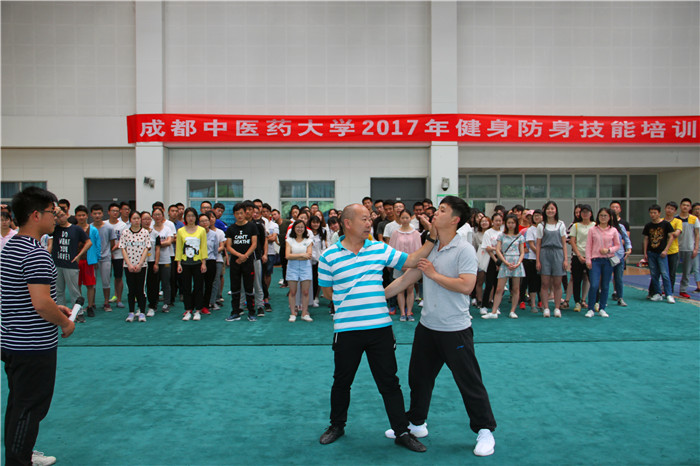 开班仪式结束后,体育学院院长、四川省大学生武术队总教练邬建卫教授为第一期培训班学员讲授防身技能的技击方法,并亲自演示如何利用肘、膝、指、头部等作为辅助武器的防身动作。随后,培训学员在武术教研室全体教师的指导下,分组进行一对一的防身技能练习。