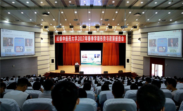 5月11日下午,学校2017年春季学期形势与政策报告会在百会堂举行,党委书记刘毅为学生深入分析解读特朗普时代的中美关系。