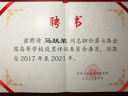 为充分发挥专家评议机构在“十三五”时期高校设置方面的政策研究和决策咨询作用, 4月10日,教育部在国家教育行政学院举行第七届全国高等学校设置评议委员会(简称第七届高评委)成立大会。本届全国高评委委员共120名,3名来自四川,原教育厅厅长涂文涛、原教育厅副厅长唐小我等受聘担任委员,beat365官网马跃荣教授出席成立大会并接受聘书。